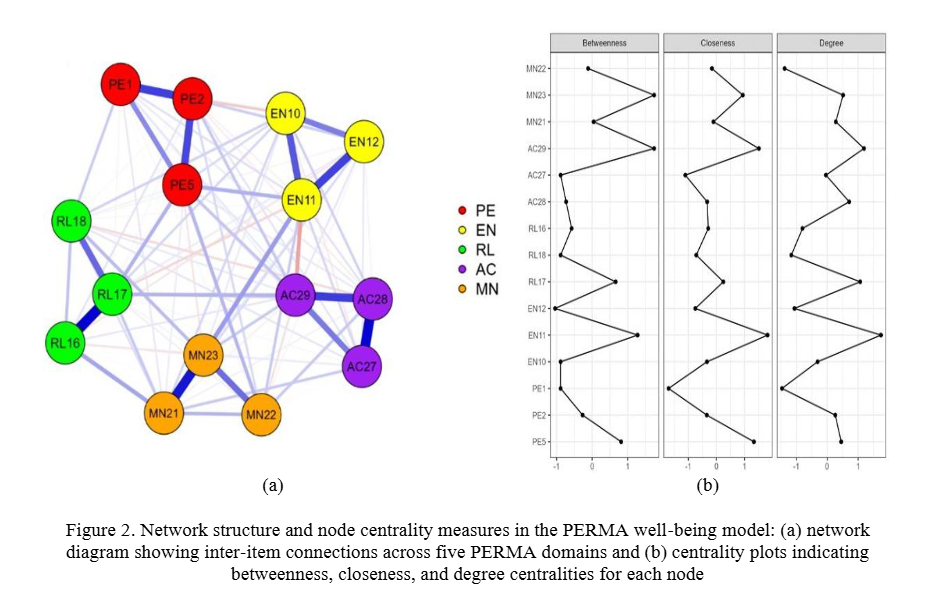 The mental health issues among undergraduate students have become increasingly recognized as a pressing concern, often impacting their overall well-being over time. Despite escalating scholarly attention to students’ well-being, a significant gap persists in theoretical frameworks and measurement instruments with established benchmarks, particularly those applicable to the Thai context. This study aims to develop and validate a contextually appropriate well-being instrument for Thai university students, grounded in the PERMA model, which examines five dimensions: positive emotion, engagement, relationships, meaning, and accomplishment. A multistage sampling approach was utilized to enlist 1,080 participants for an online questionnaire incorporating the PERMA well-being scale. The data were examined through confirmatory factor analysis (CFA) and network analysis to assess the structural validity and inter-item correlations. Results from the second-order CFA yielded an excellent model fit with RMSEA = 0.013, with all the constructs significant at p < .001. In addition, network analysis showed centrality within constructs. The findings revealed that the PERMA model was indicative of Thai university students’ well-being, exhibiting robust internal consistency and significant intra-construct correlations. This contextually relevant instrument yielded valuable insights for educators and policymakers in Thailand, providing strategies to evaluate and improve student well-being.